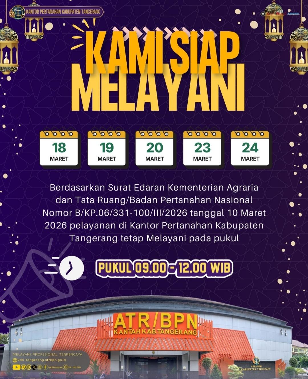 Pada tanggal 18, 19, 20, 23, dan 24 Maret 2026, Kantor Pertanahan Kabupaten Tangerang tetap membuka layanan pada pukul 09.00 s.d. 12.00 WIB.